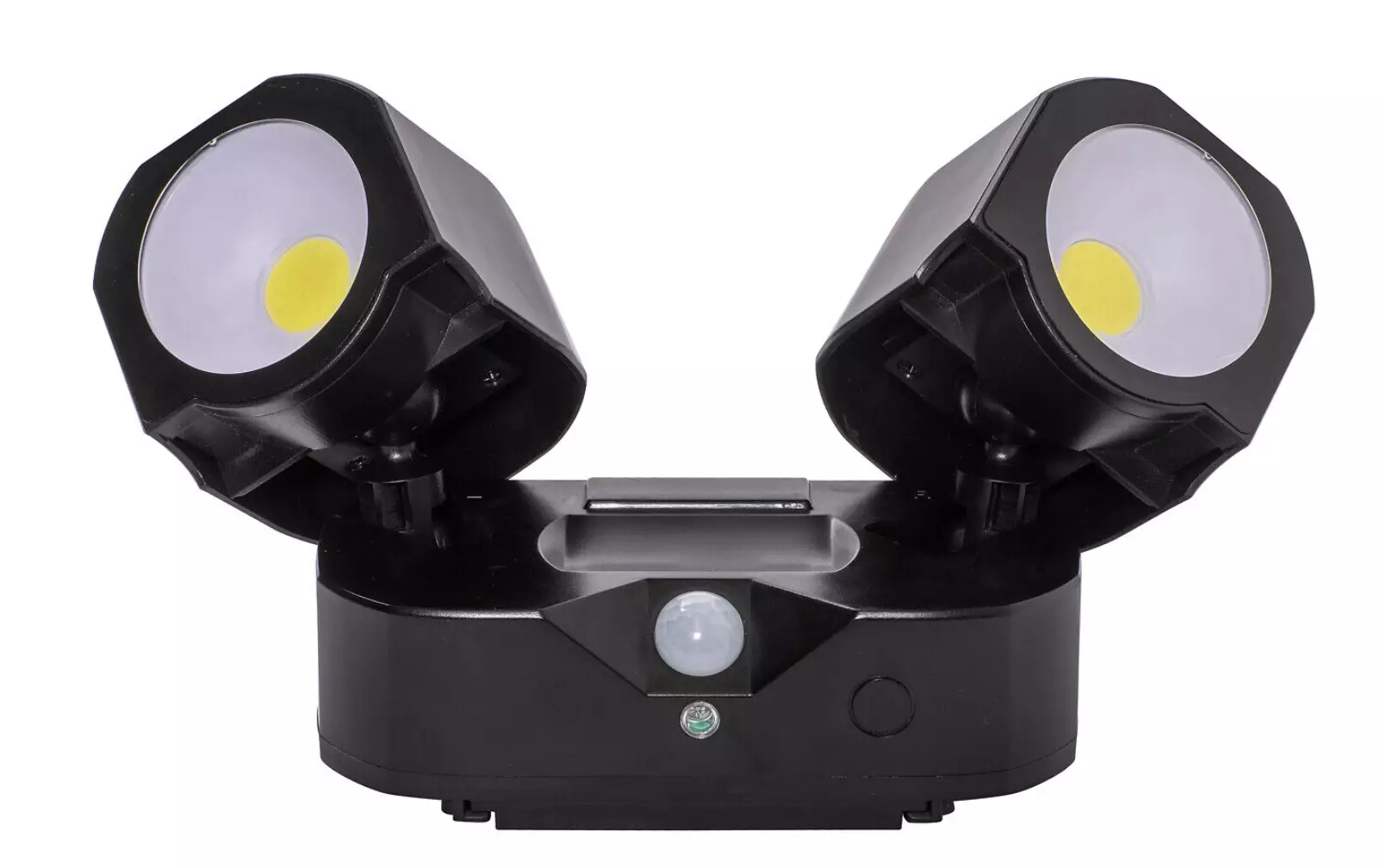 - Materiaali muovi, musta. Liiketunnistin ja hämäräkytkin. On/off-kytkin valaisimen takaosassa. - 2 x 2 W COB-led, 230 lm. - Kiinnitä asennuslevy ruuveilla haluttuun pintaan, reunan aukko ylöspäin. Liu'uta valaisin levyn uriin yläkautta. - 152 x 73 x 110 mm. - Teho 4 W - Jännite 4,5 V - Paristot 3 x AA - PIR-anturin havainnointikulma < 100° - PIR-anturin havainnointietäisyys < 8 m - Suositeltu käyttölämpötila 0 ... 30 °C - Kotelointiluokka IP44