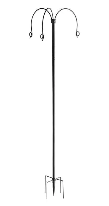 Kolmikoukkuinen amppeli- ja lyhtyteline. Teline on putkirunkoinen ja koostuu 42 cm pitkistä palasista, joten telineen korkeutta voi säädellä tarpeen mukaan. Telineen maksimikorkeus on 2,1 m maapiikkeineen. Max. kuormitus / koukku 15 kg, yhteensä 45 kg. Yhtä koukkua käytettäessä max. kuormitus 5 kg. Takuu 1 vuosi.
