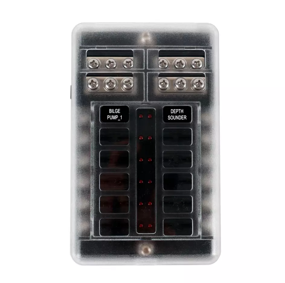 Kytkentäkiskoilla oleva sulakerasia 12:lle lattasulakkeelle. Päävirtakisko M5 ruuviliitoksella, jossa suositeltu virtajohdon koko 16-25mm2. Sulakepaikat max. 30A M4 ruuviliitoksella ja suositeltu virtajohdon koko 1,5-2,5mm2. LED-valo ilmoittaa jos sulake on palanut. Läpinäkyvä suojakansi. Tarrasarja lattasulakkeille Englannin kielinen.