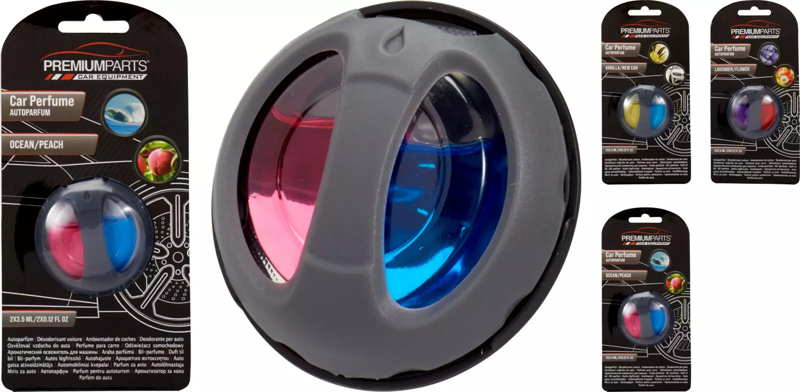 Auton sisätilaan kiinnitettävä kahden tuoksun ilmanraikastin. Pullossa kaksi 3,5 ml:n säiliötä, joissa raikkaat tuoksut: ocean/peach, vanilla/new car tai lavendel/flower