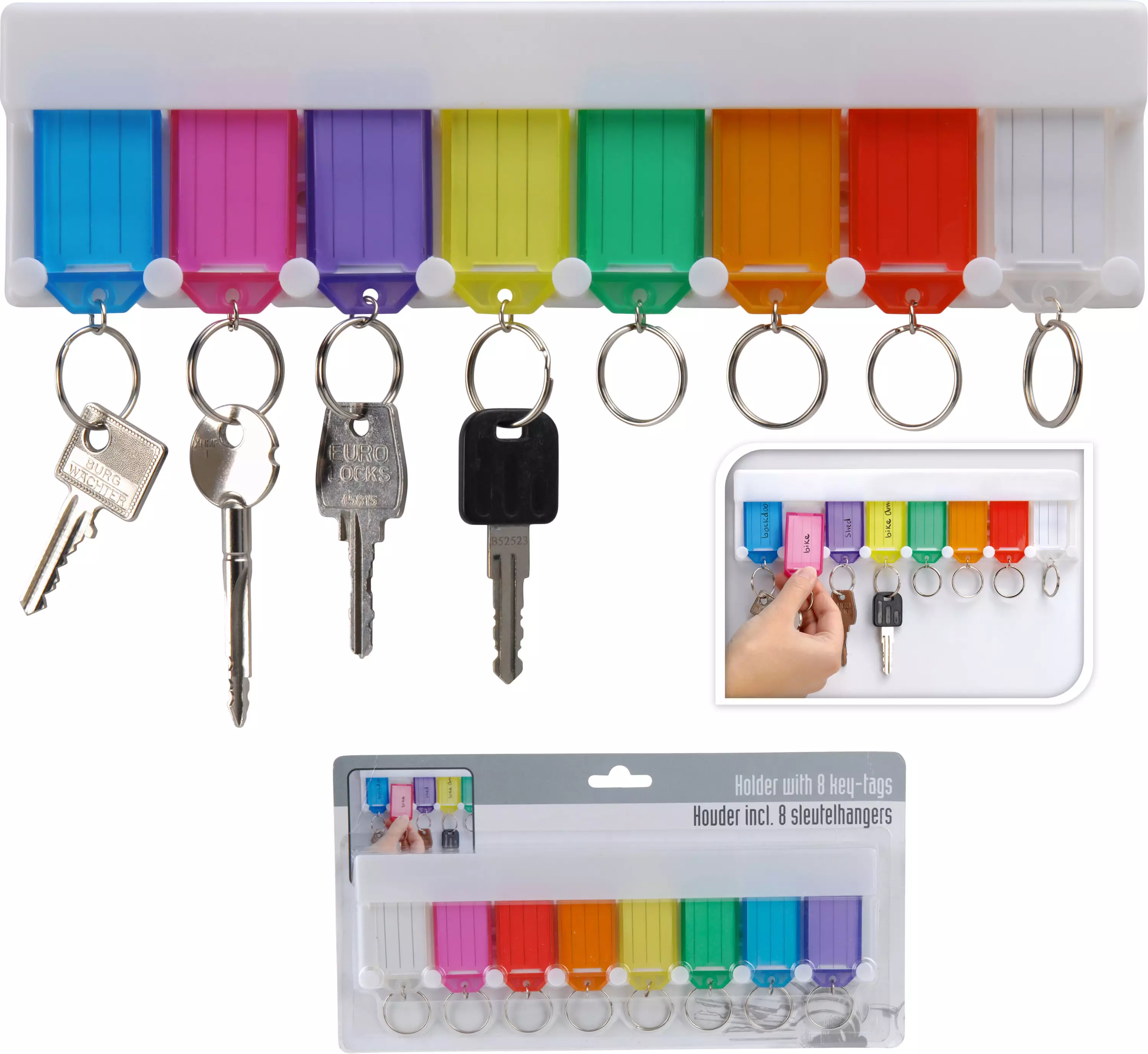 Seinään kiinnitettävä näppärä teline avaimenperille. Mukana 8 kpl isoa eriväristä avaimenperää joihin voi kirjoittaa tekstiä esim. mökki, pyörä, varasto, vene jne.