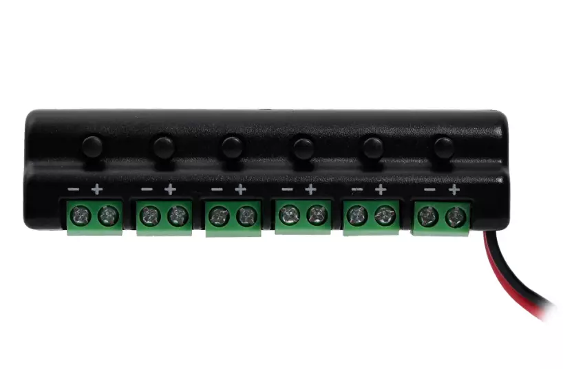 6-porttinen jakotukki päälle/pois kytkimillä, 12 V DC.