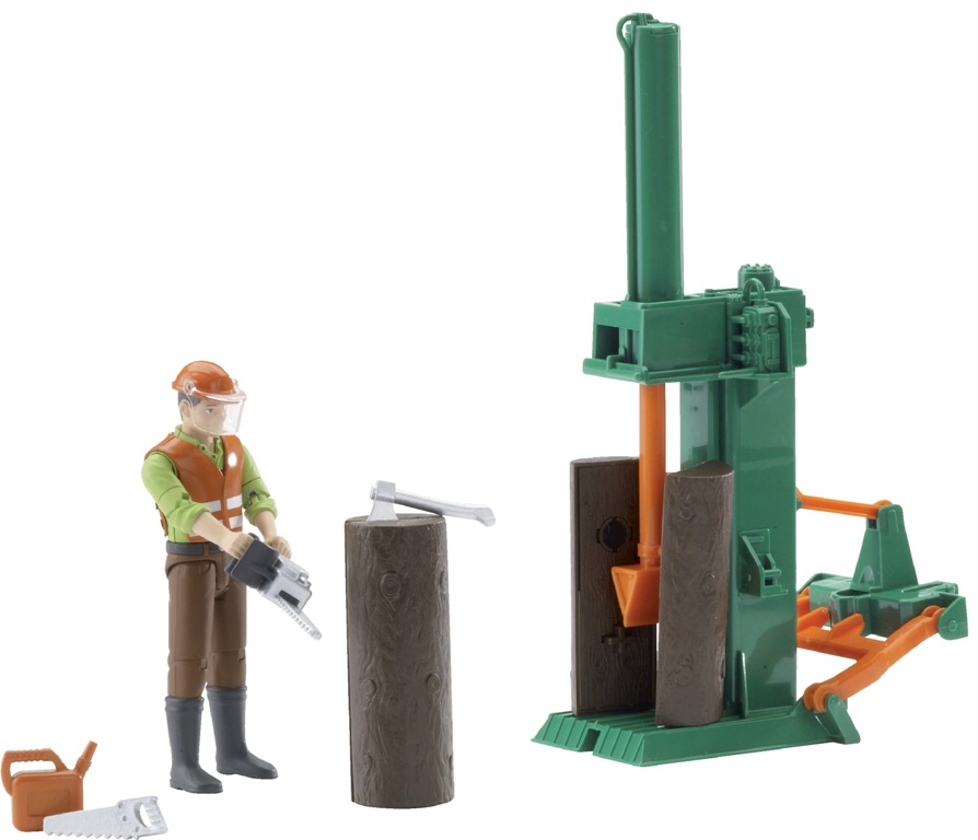 Bruderin Profi-sarjan halkaisukone hahmolla ja tarvikkeilla. Settiin sisältyy muun maussa halkaisukone, hahmo, neljä halkoa, kirves, polttoaineastia, kypärä ja moottorisaha.