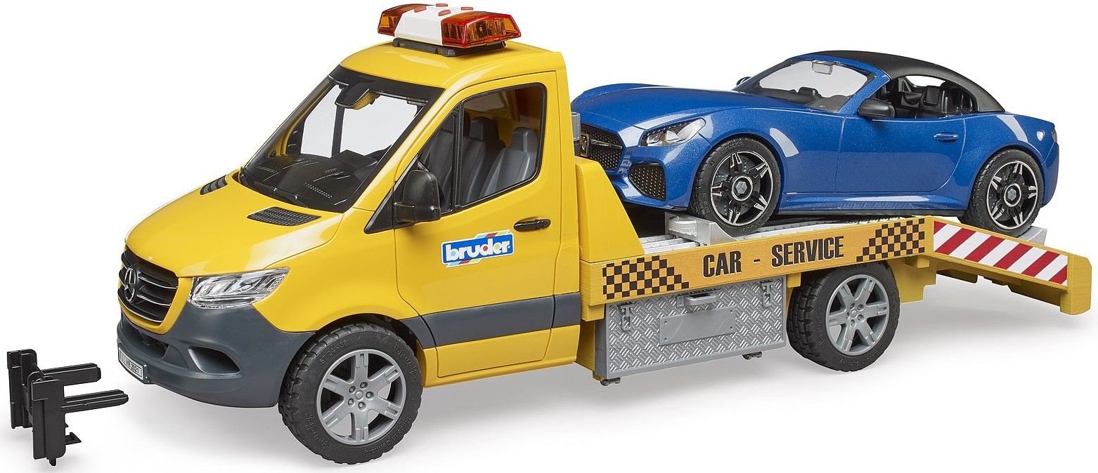 Bruder MB Sprinter-hinausauto valo- ja äänimodulilla, vinssillä, ajorampeilla ym. hienoilla yksityiskohdilla, sekä Roadster urheiluauto irrotettavilla ovilla ja katolla.