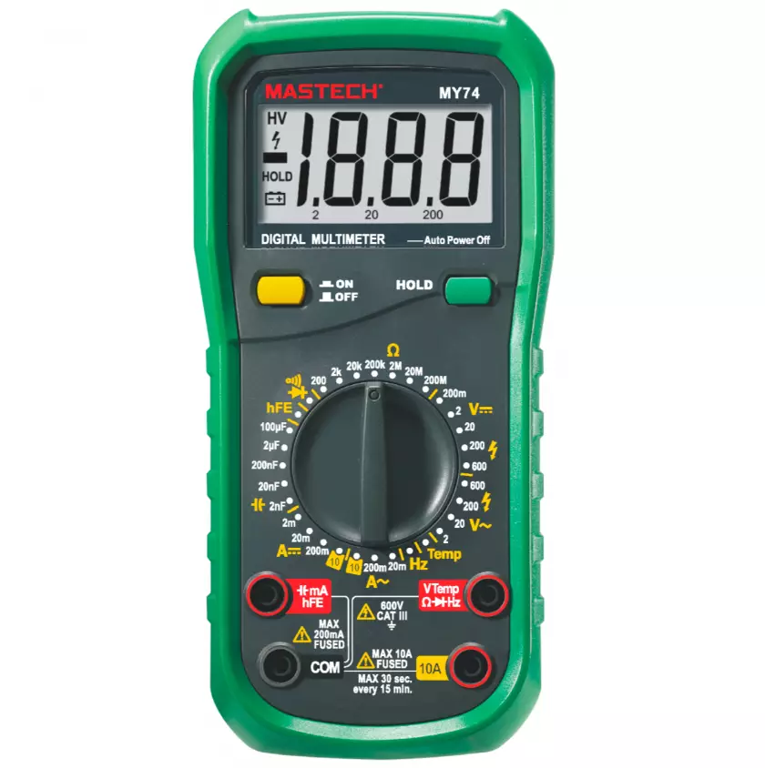 Mastech digitaalinen yleismittari 600 V, CE. Vakiovarusteina seisontatuellinen suojakotelo, K-tyyppinen lämpötila-anturi -50 ...+250 celsius astetta. Mittajohdot 10 A ja englanninkieliset... Lue lisää