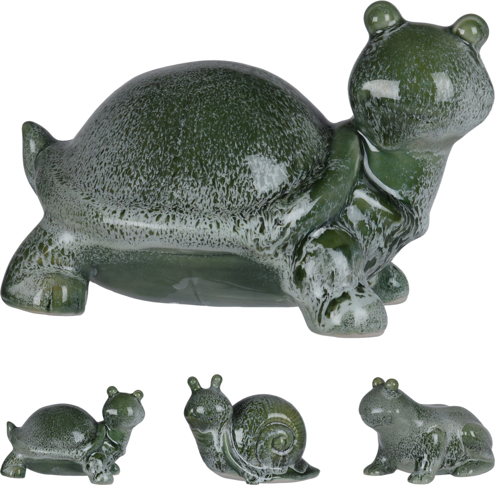 Saatavana 3 vihreää lasitettua eläinpatsasta: sammakko, etana ja kilpikonna - materiaali: posliini - väri: vihreä Mitat: * sammakko 14x20x13,5cm * etana 10x20x13cm * kilpikonna 14x20x13,5cm... Lue lisää