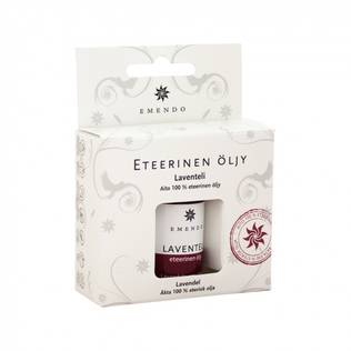 Aito 100% eteerinen öljy Laventeli (Lavandula angustifolia) 10 ml:n pakkauksessa. Monikäyttöinen laventeliöljy rentouttaa, rauhoittaa ja tasapainottaa mieltä sekä lisää univalmiutta. Emendon aidot 100% eteeriset öljyt sopivat aromaterapiaan ja tuoksulyhtyihin. Öljyt ovat helppokäyttöisiä ja riittoisia