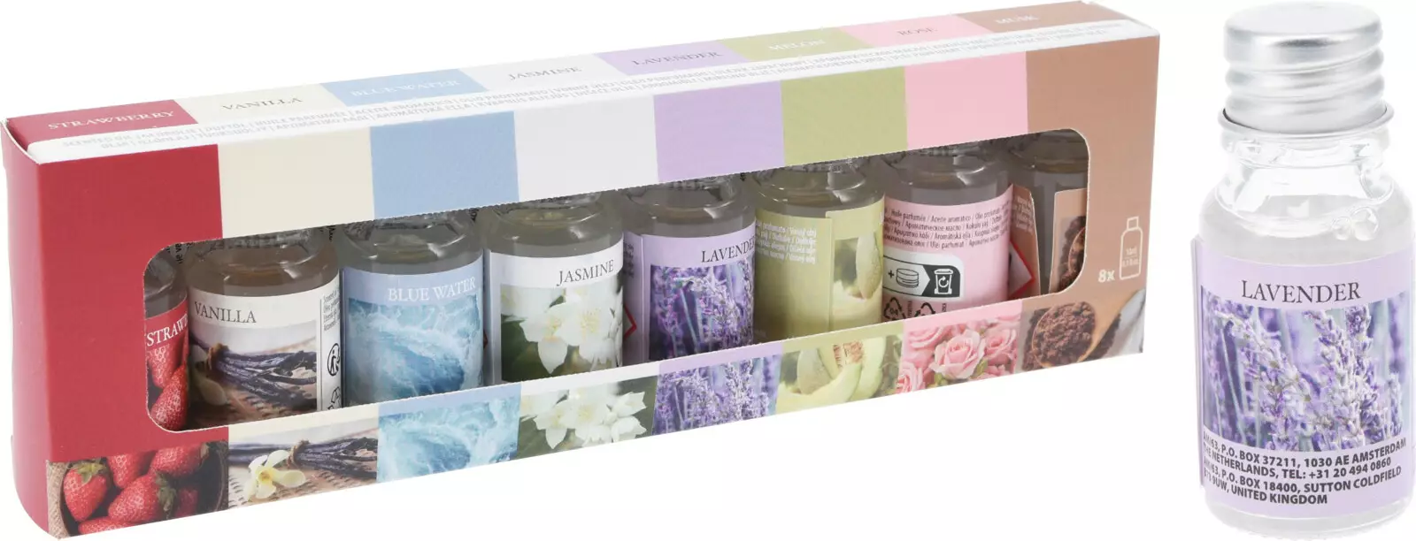 pakkauksessa 8 erilaista tuoksuöljyä - tuoksut: Strawberry, Vanilla, Blue Water, Jasmine, Lavender, Melon, Rose ja Musk