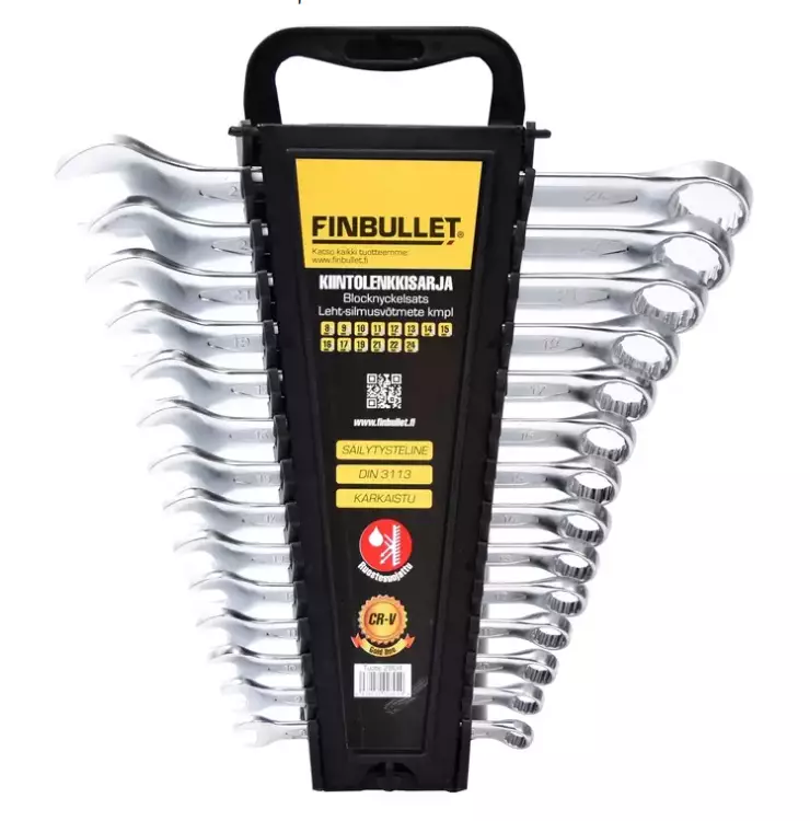 Finbullet kiintolenkkiavainsarjassa on 14 avainta mattapintaiseksi viimeisteltynä. Kokolajitelma: 8, 9, 10, 11, 12, 13, 14, 15, 16, 17, 19, 21, 22, 24 mm. Materiaali: Cr-V DIN 3113 hyväksytty.... Lue lisää
