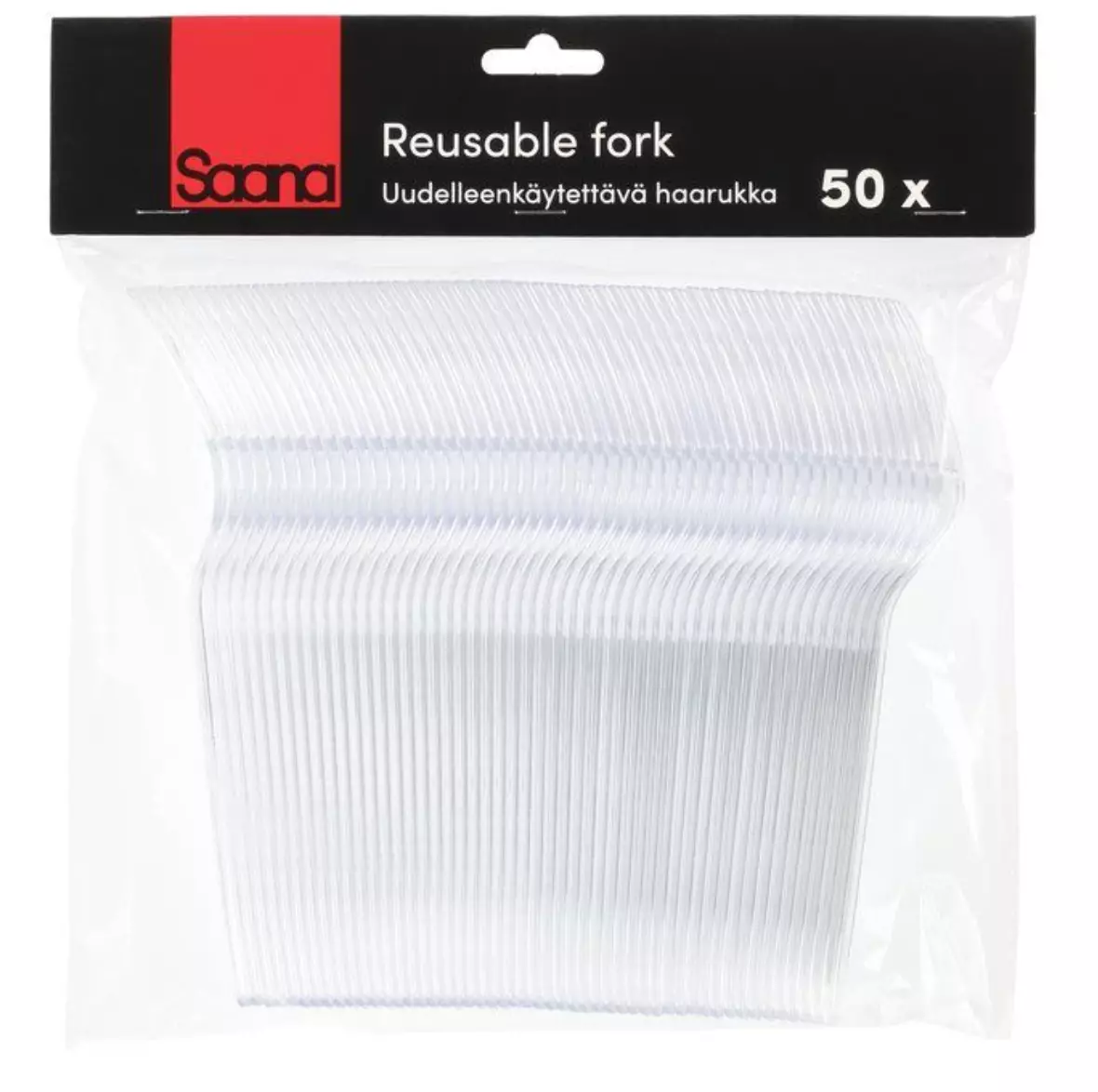 Saana-haarukka on kestävä ja uudelleenkäytettävä vaihtoehto. Kirkas ulkoasu sopii monenlaisiin kattauksiin. Pituus 18 cm. Konepesun kestävä. Pakkaus sisältää 50 kappaletta.