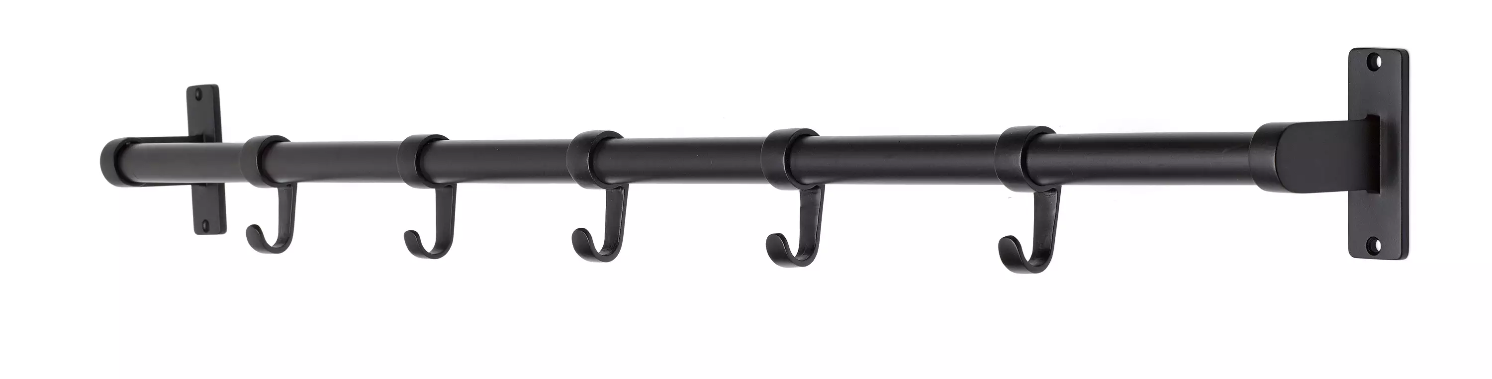 Perinteinen 5-koukkuinen naulakko modernilla muotoilulla - mustaksi maalattua puuta, koukut sinkkiä/samakkia - soveltuu eteiseen, vaatehuoneeseen, makuuhuoneeseen jne. - leveys 560 mm - taustan...