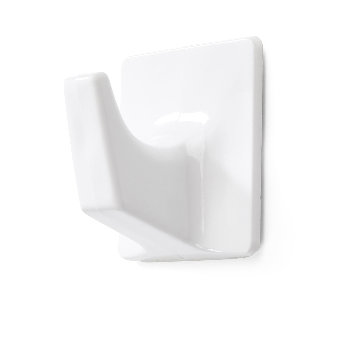 Valkoinen muovkoukku tarrakiinnityksellä.