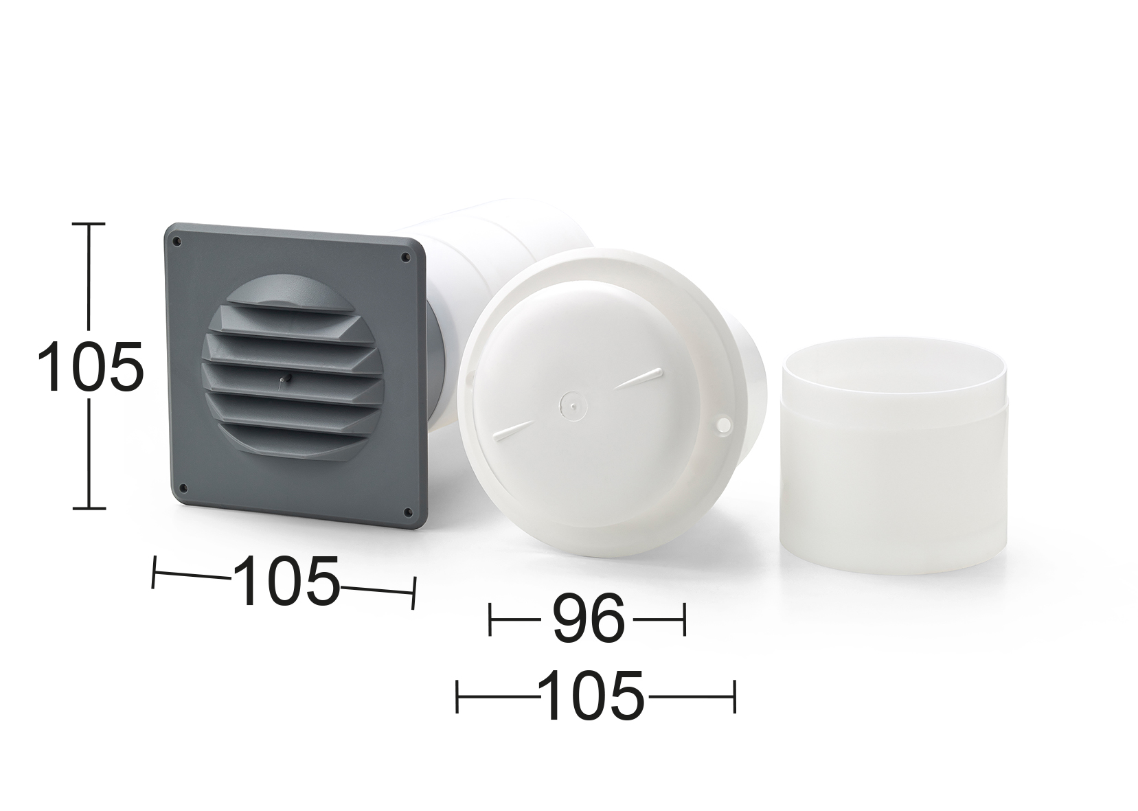 Muovinen teleskooppiventtiili seinille, joiden paksuus on 165-310 mm. - putken halkaisija: 75 mm - väri: valkoinen/harmaa