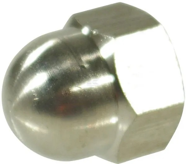 Kuusikulmainen ruostumattomasta teräksestä valmistettu hattumutteri metrisellä kierteellä.