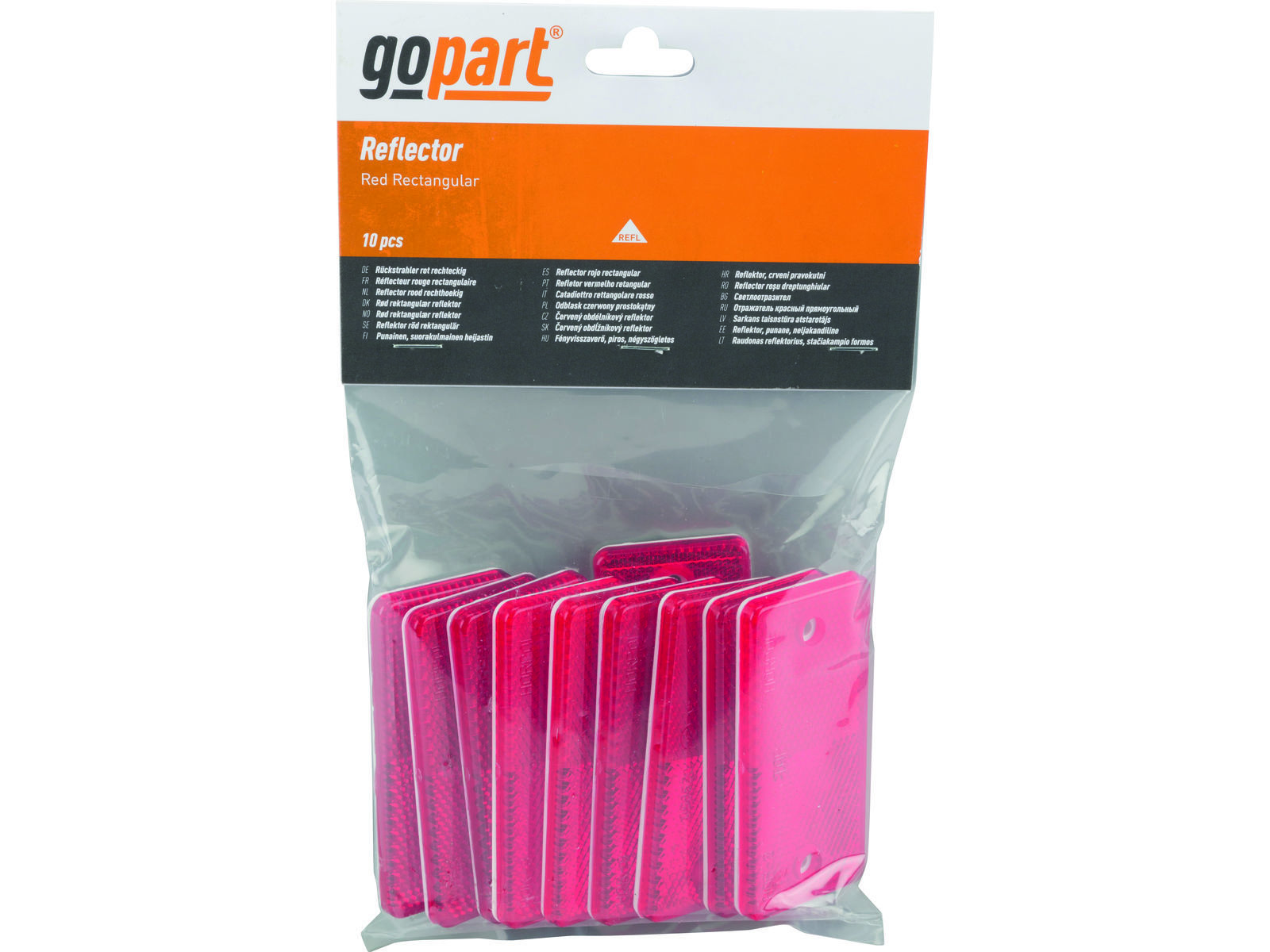 Heijastin, GoPart, suorakaide, ruuvattava, punainen - koko: 9,4x4,4 cm - paksuus 0,8 cm - ruuvireikien väli 7,0 cm - ruuvi 4,4 mm - 10 kpl/pss