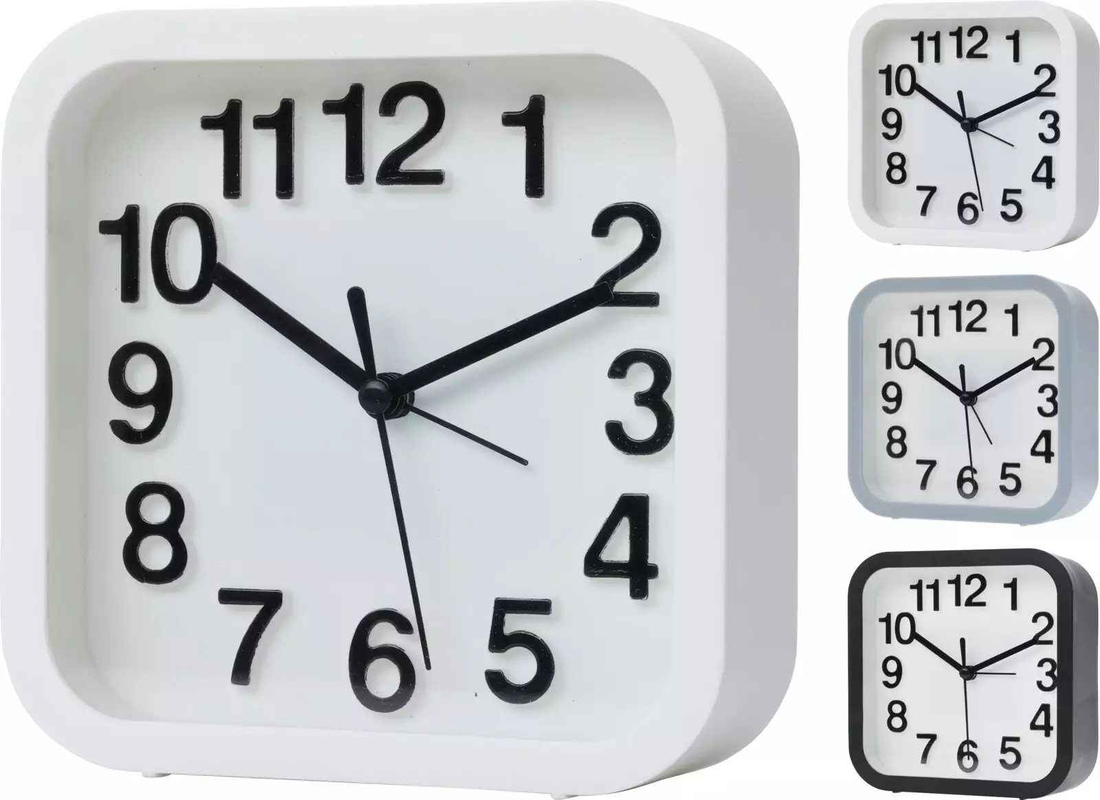Muovinen herätyskello selkeällä näytöllä - mitat 13x5x13 cm - lajitelmassa mustia, harmaita ja valkeita kelloja, joista tilatessasi saat jonkin.