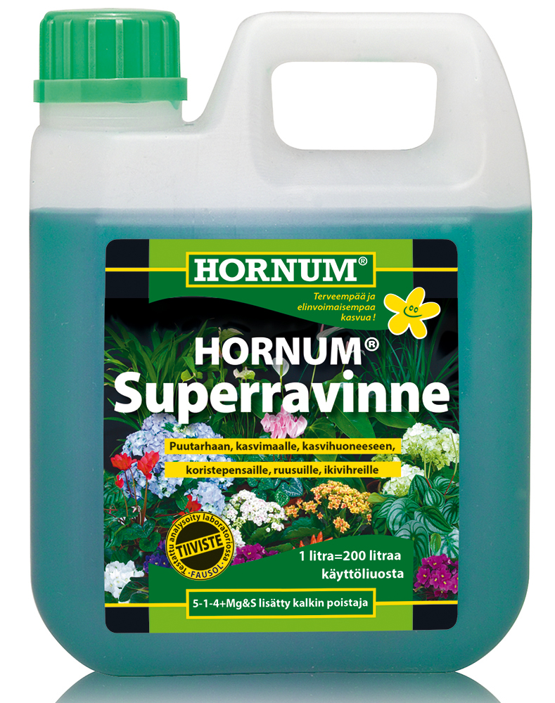 Hornum Superravinne on nestemäinen peruslannoite kaikille kasveille. - sopii huonekasveille, kasvihuonevihanneksille, parvekekukille, ruusuille, perennoille, pensaille ja ikivihreille - parantaa... Lue lisää