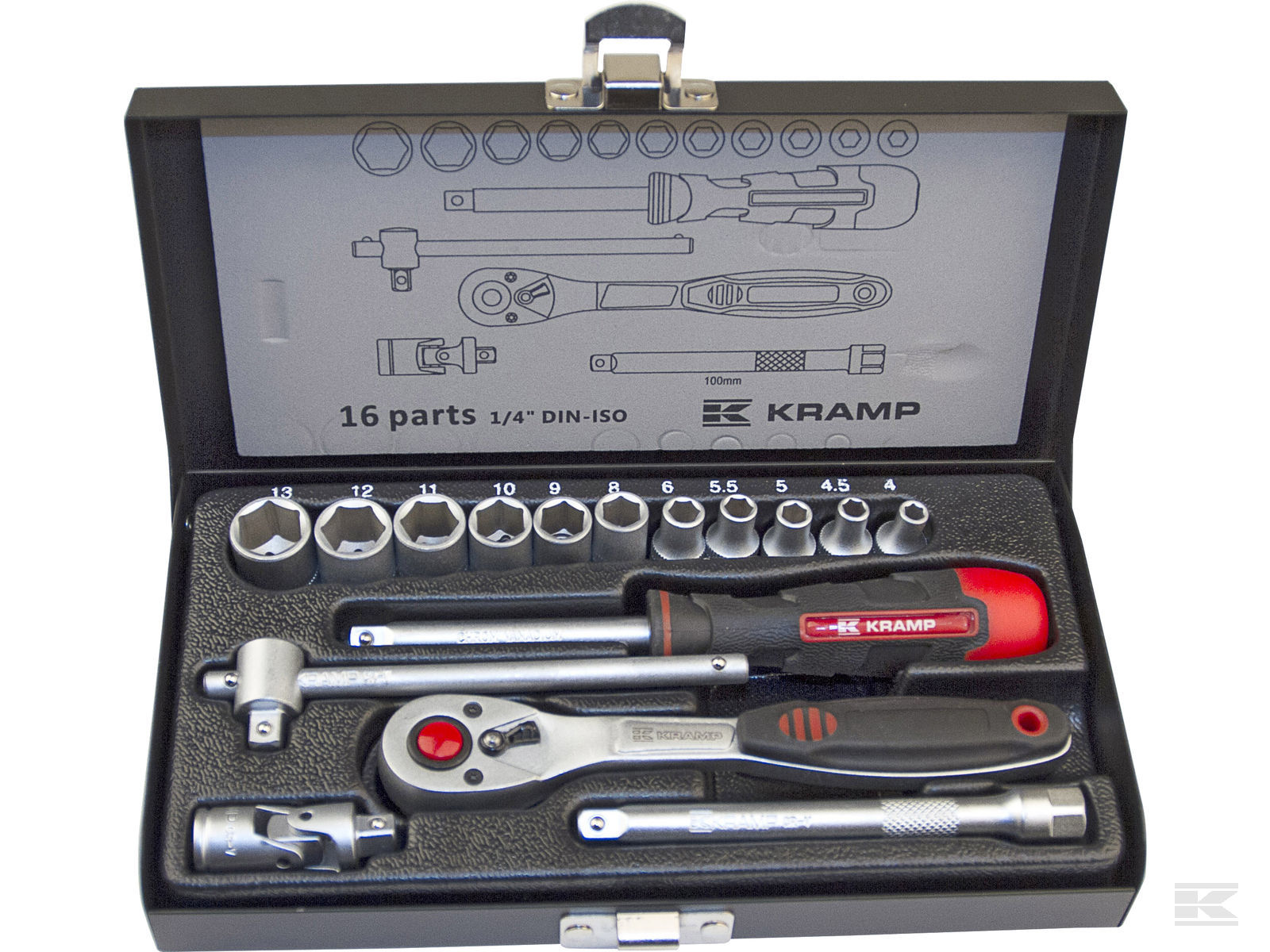 Ammattikäyttöön soveltuva 16-osainen hylsysarja, joka sisältää hienohampaisen räikkäavaimen ja erilaisia kromivanadiumteräksestä valmistettuja hylsyjä, 1/4" vääntiö. Selkeästi jaotellussa, lujassa ja kestävässä metallikotelossa.