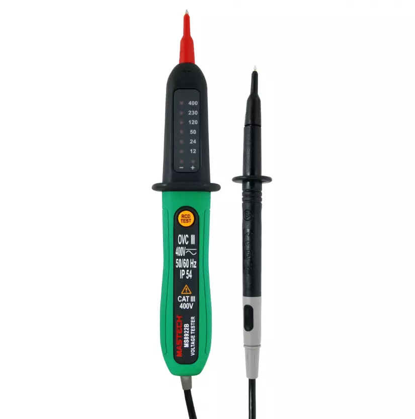 Jännitteenkoetin mahdollistaa nopean ja helpon tavan testaa AC ja DC jännitteen 400V asti, sekä vikavirtatestauksen.