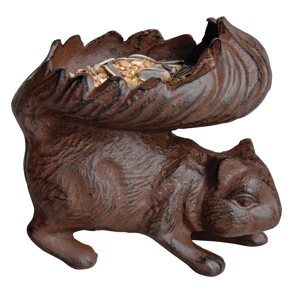 Kaunis käyttöesine puutarhaan, jonne oravat ovat tervetulleita! Valurautaisen oravan hännänmutkassa on puutarhan villieläimiä varten paikka juomavedelle tai pähkinöille.