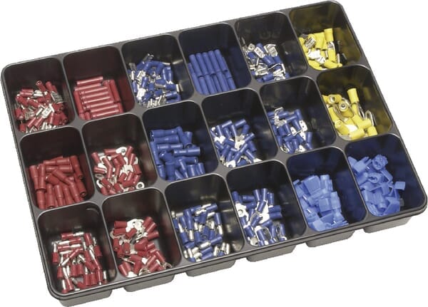 Sisältö: Punaiset: 50 kpl 6,3x0,8 mm, 25 kpl Ø4, uros & naaras, 25 kpl M4 & M5 Siniset:25/50 kpl 6,3x0,8 mm, 25 stk. Ø5, uros & naaras, 25 kpl M4 & M5 Keltaiset: 25 kpl 6,3x0,8 mm, 25 kpl M8... Lue lisää