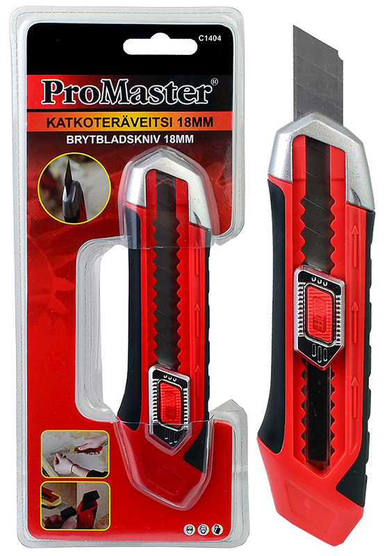 Katkoteräveitsi kumipäällystetyllä kahvalla. Veitsen kokonaispituus on 155 mm ja terän leveys 18 mm. Terä kestää käyttöä pitkäksikin vedettynä.