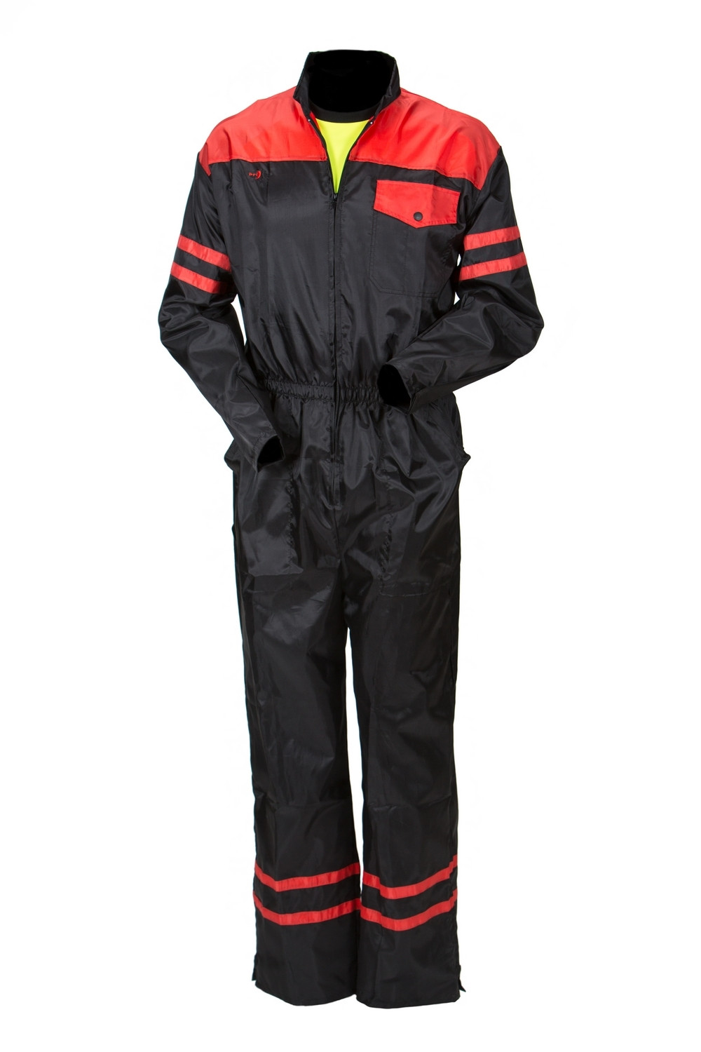 - musta haalari, jossa punainen hartiaosa ja tehosteraidat
