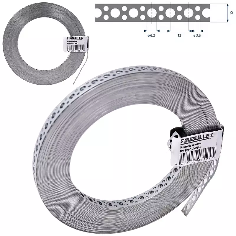 Kiinnitysvanne 12 mm x 0,7 mm x 25 m, 3,3/6,2 mm rei'illä