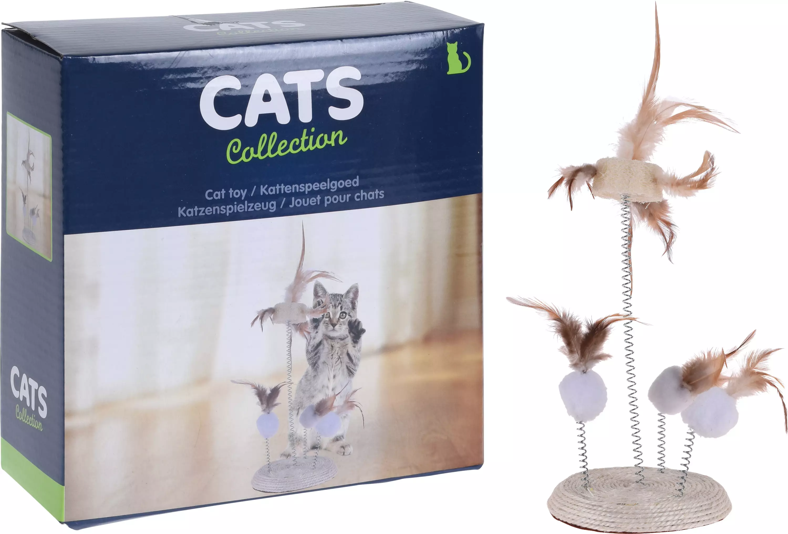 Kissan puuhakeskus - vieterin päässä olevaa lelua - pohjan halkaisija 15 cm - korkeus 26 cm - materiaaleina höyheniä, juuttinarua, luffa-sientä, keinokuitua, metallia
