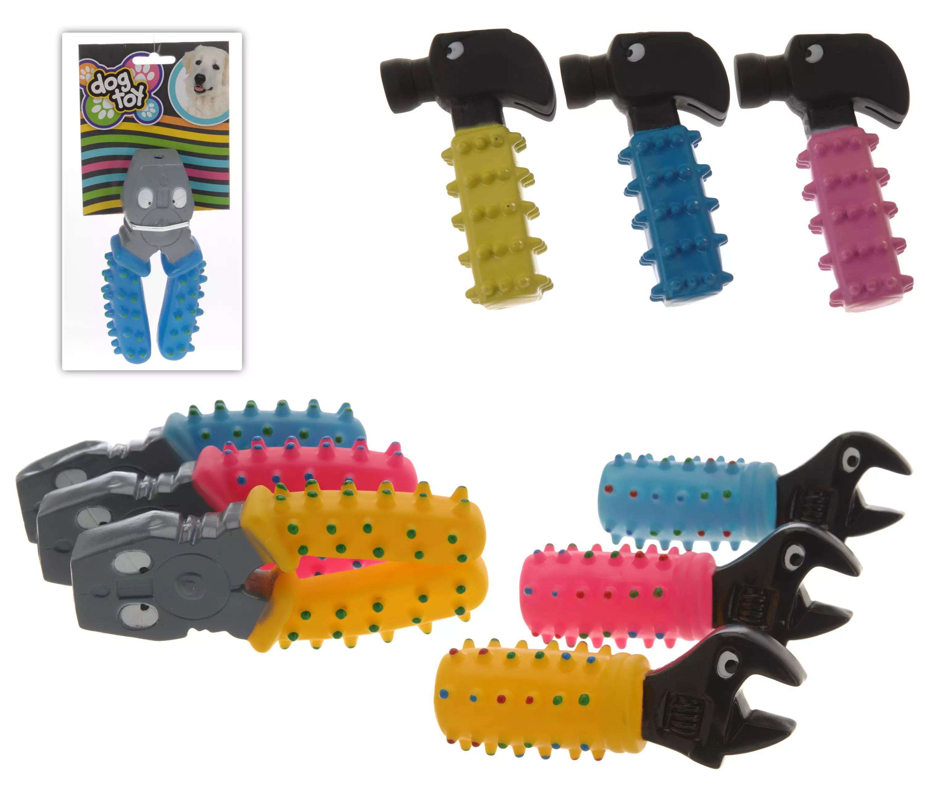 koiran lelu - materiaali: PVC - vasara, pihdit tai jakoavain - värit: pinkki, keltainen ja sininen - korkeus noin 15 cm