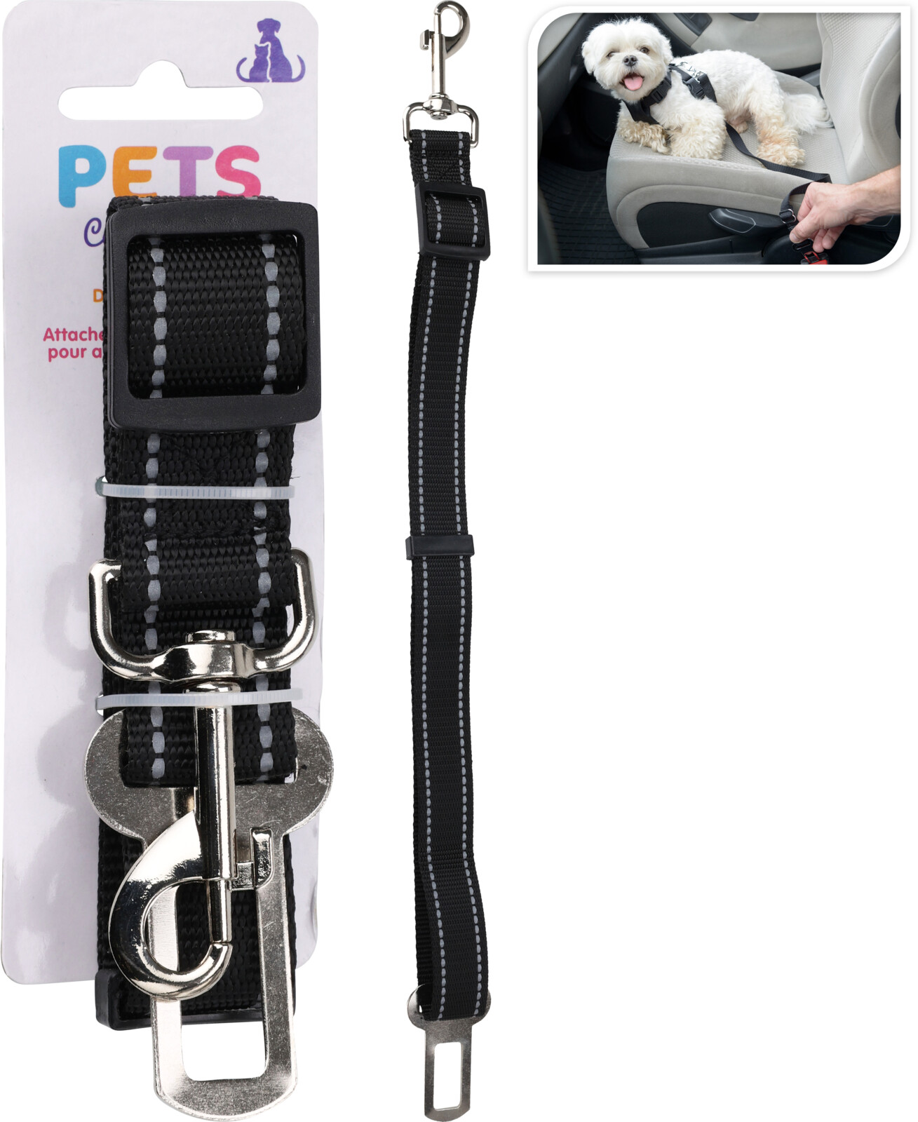 - toinen pää kiinnitetään turvavyön vastakappaleeseen, toinen pää koiran valjaisiin