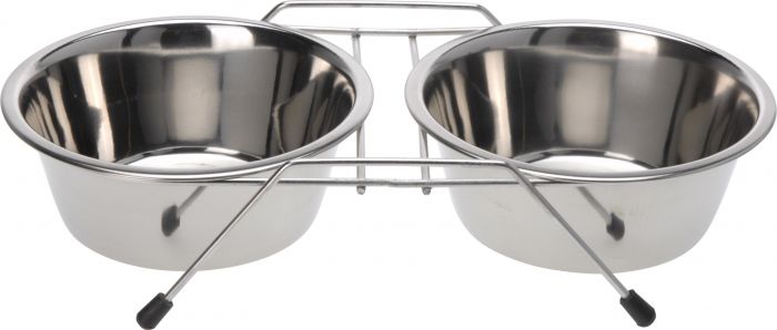 Ruoka-astia koirille ruostumattomasta teräksestä - sisältää 2 irroitettavaa kulhoa: ruokakupin ja vesikupin - kulhot ovat 7,5 cm korkeita ja niiden halkaisija on 16,5 cm