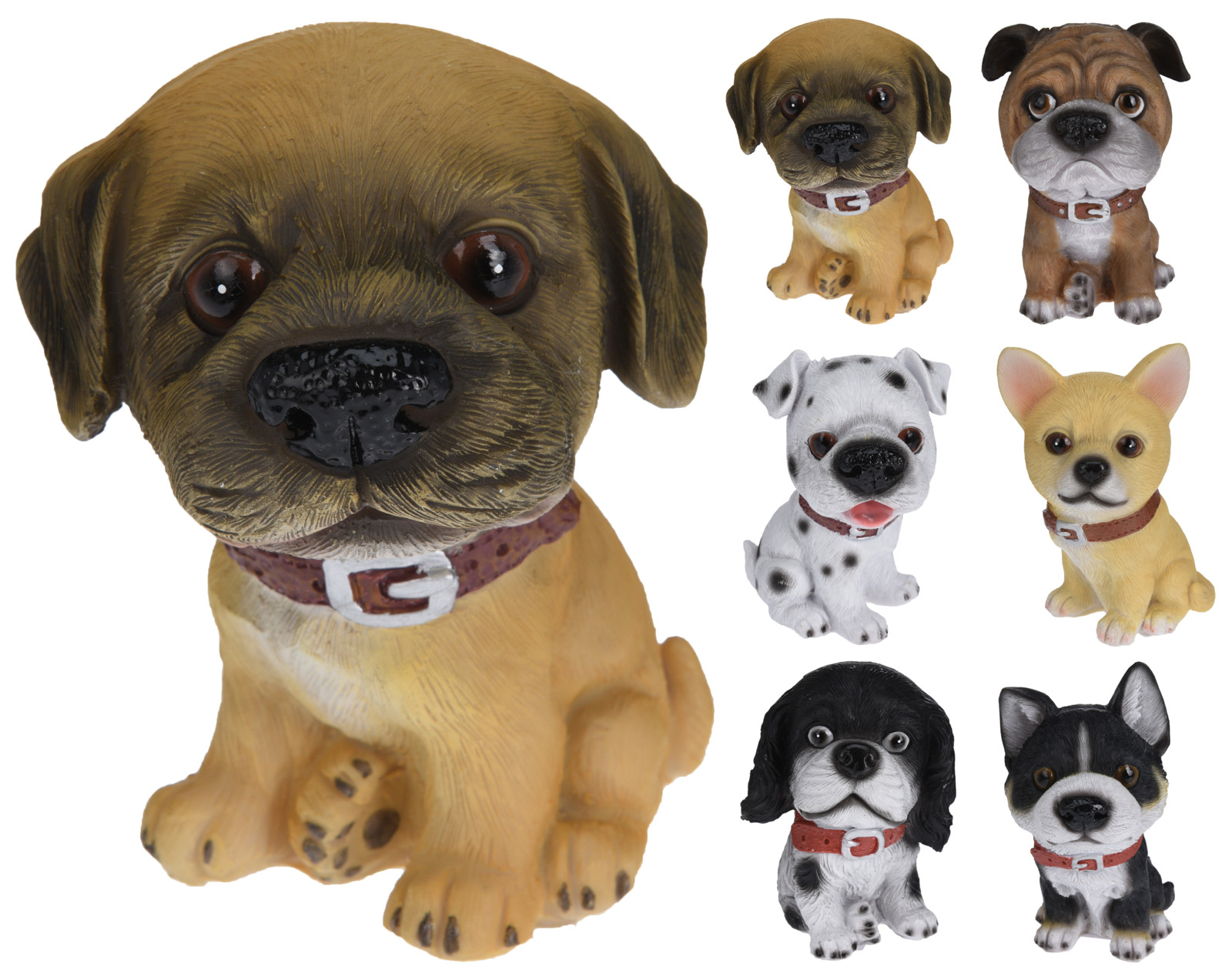 Suoloinen koiranpentupatsas sisä- ja ulkokäyttöön - materiaali polystone - mitat 95x 70 x 135 mm Lajitelmassa 6 erilaista koiraa ( kuvassa ), joista saat jonkin varastotilanteen mukaan.... Lue lisää