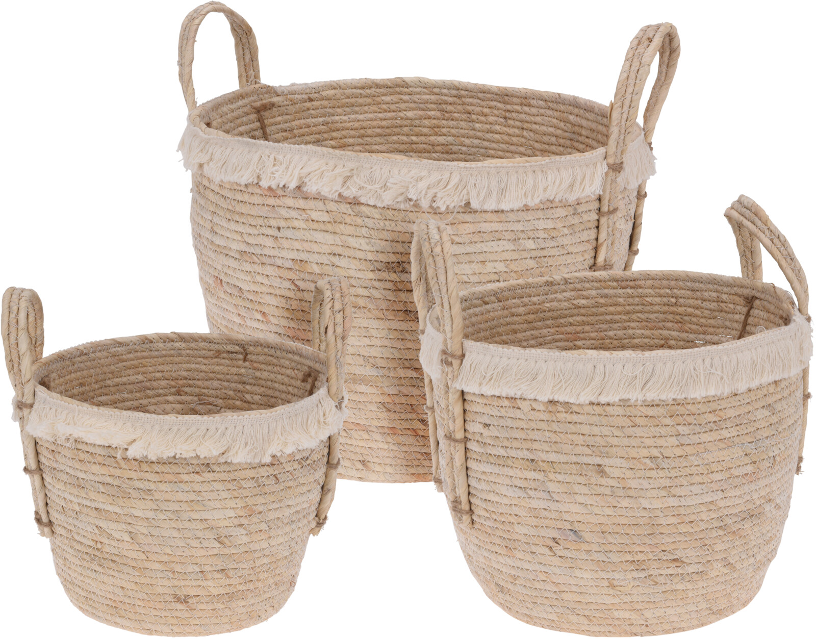vaalea punottu kori hapsukoristeella - halkaisija 28 cm - korkeus 23 cm - kuvan koreista keskikokoinen