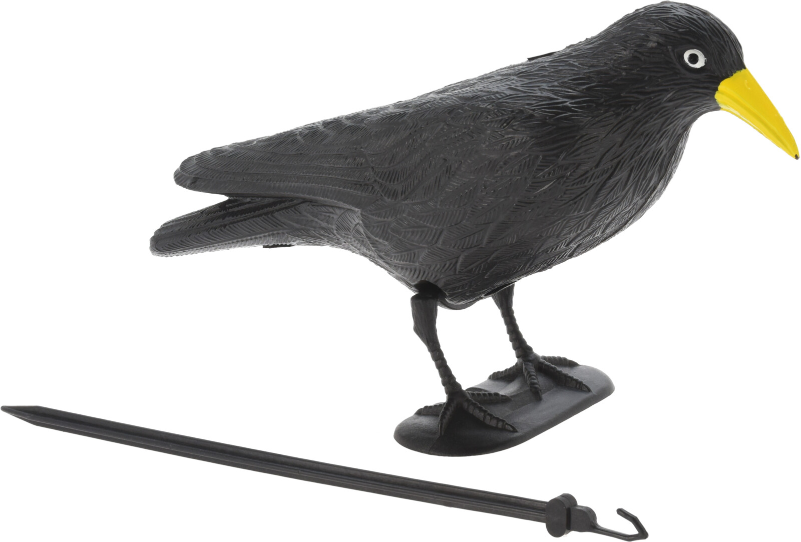 musta korppi linnunpelätin - materiaali: muovi - mukana tikku, jolla linnun saa kiinnitettyä maahan - paino noin 150 g - mitat: 36 x 10.5 x 10.5cm