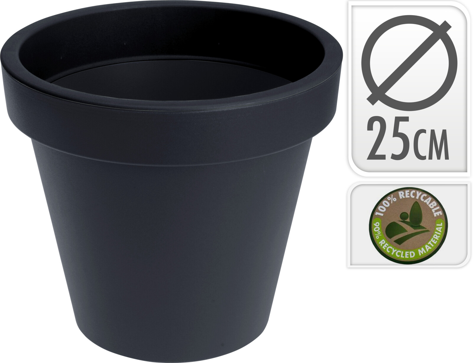 muovinen tummanharmaa kukkaruukku - kierrätysmuovia - pohjassa reikä ylimääräisen kasteluveden pois valumiseksi - halkaisija yläosasta: 25 cm - pohjan halkaisija: ?? - ruukun korkeus: 22,5 cm... Lue lisää