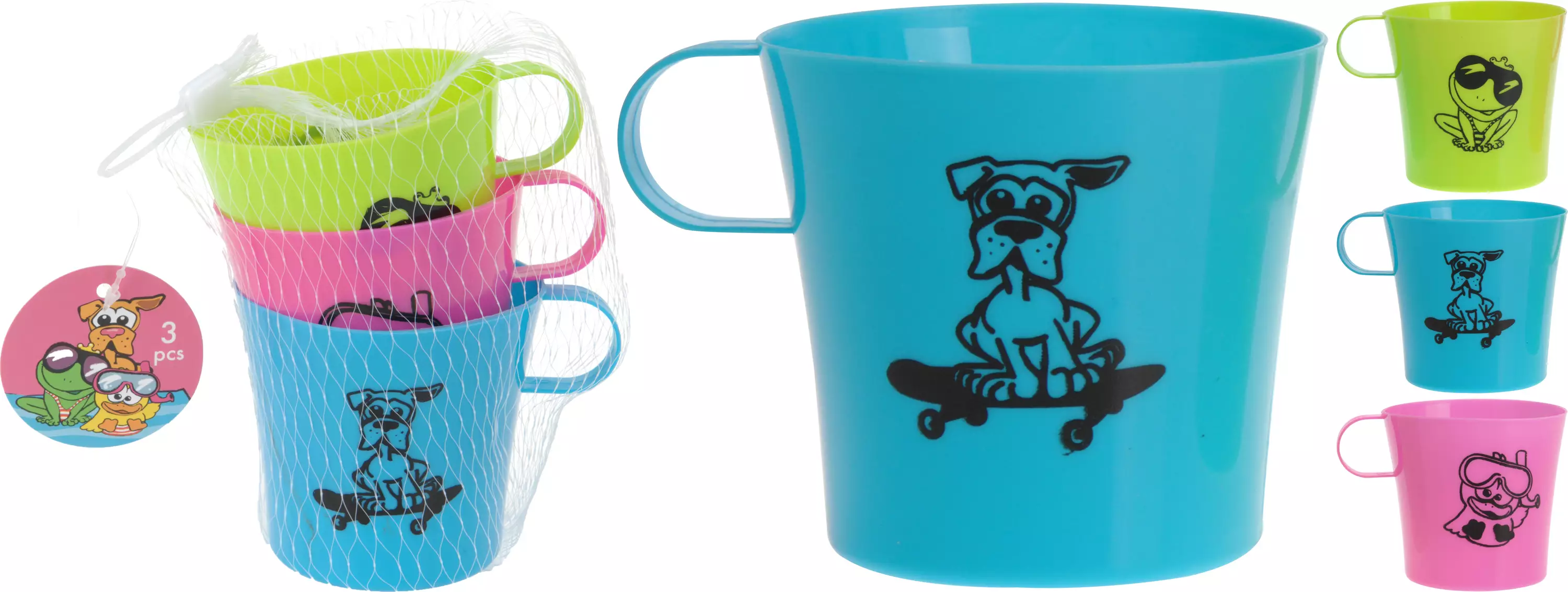 Lasten muovinen mukisetti - sis. 3 eriväristä mukia piirroskuvalla -mukin korkeus 80mm -halkaisija 80mm