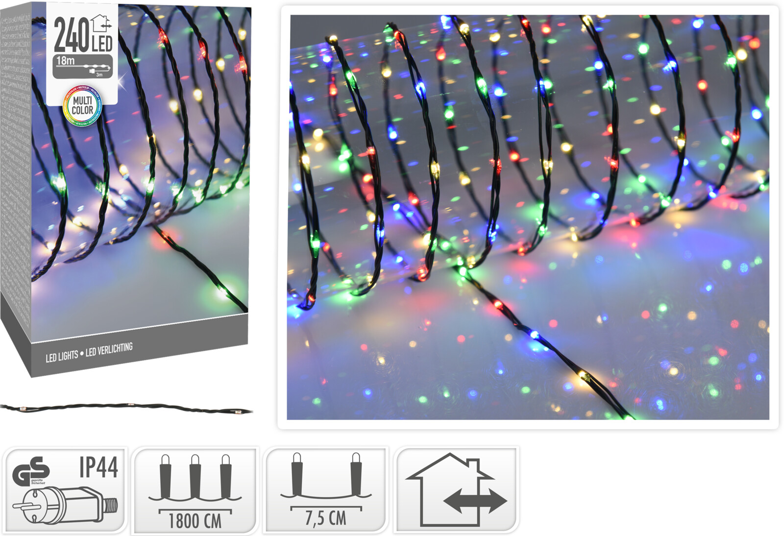 Monivärinen led-valosarja sisä- ja ulkokäyttöön - 240 lediä - pituus 3 metriä - IP 44 - lamppujen väli 7,5 cm - virtajohto 3 metriä