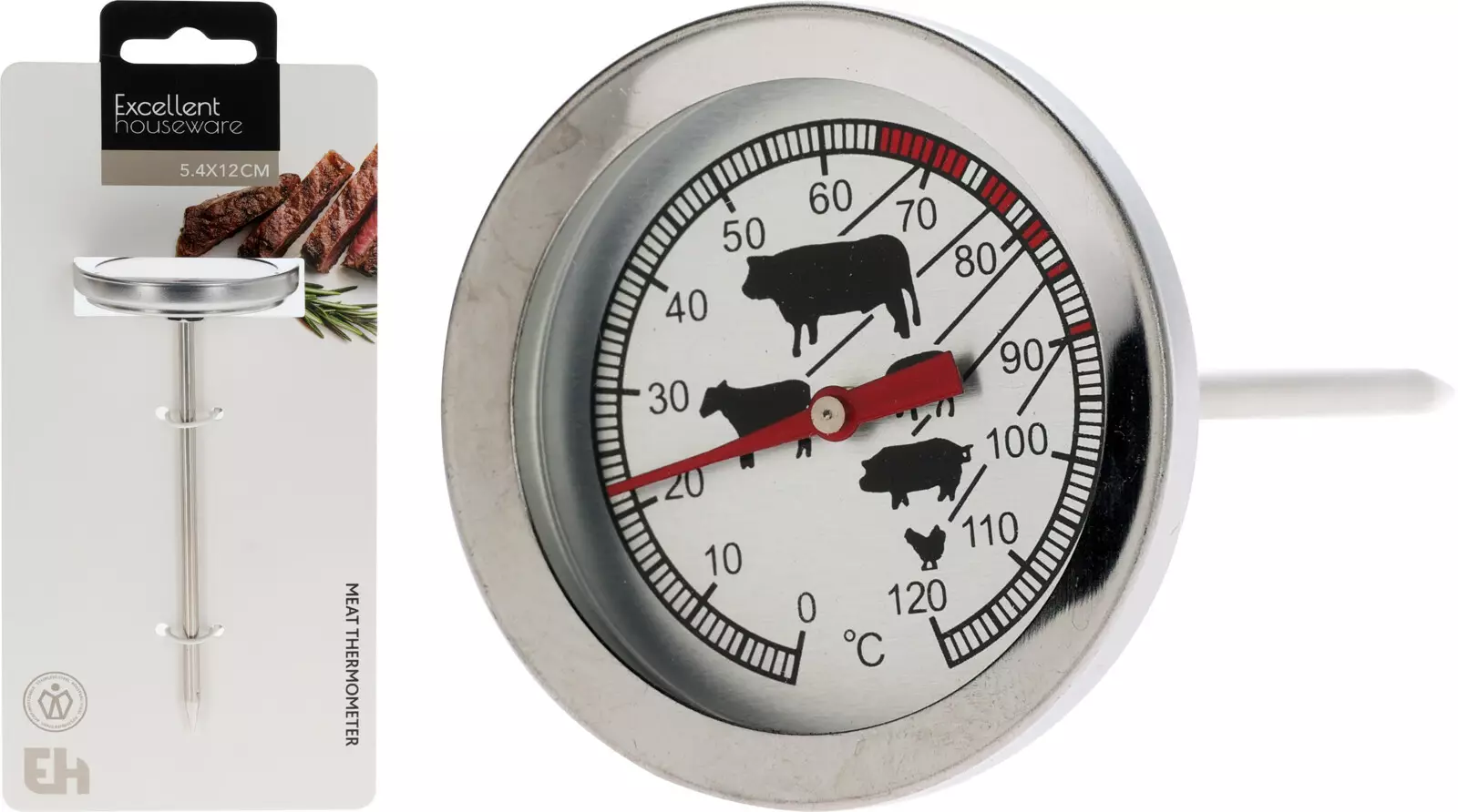 perinteinen lämpömittari ruuan valmistamiseen uunissa - kuvitettu lämpöasteikko - mitat: 100x53x190mm