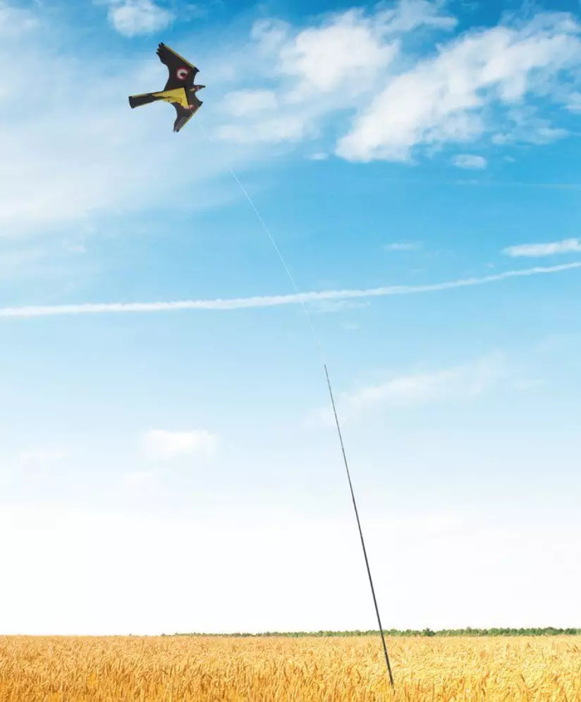 Asennuspiikin halkaisija 25 mm, teleskooppipylvään pituus 5 m Leijan koko 140 x 70 cm. Tuulessa lentävä UV-suojattu linnunpelätinleija. Korkea tolppa takaa hyvän näkyvyyden ja suuren vaikutusalueen. Naru 3 metriä mukana.