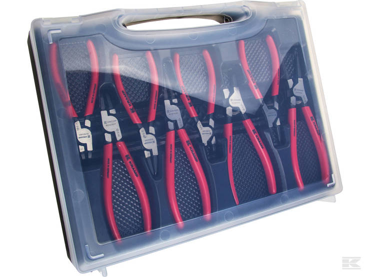 8-osainen lukkorengaspihtisarja, joka sisältää suorilla ja 90°:n kulmassa olevilla kärjillä varustettuja lukkorengaspihtejä sekä sisäisiä että ulkoisia lukkorenkaita varten. - Kahvoissa on... Lue lisää