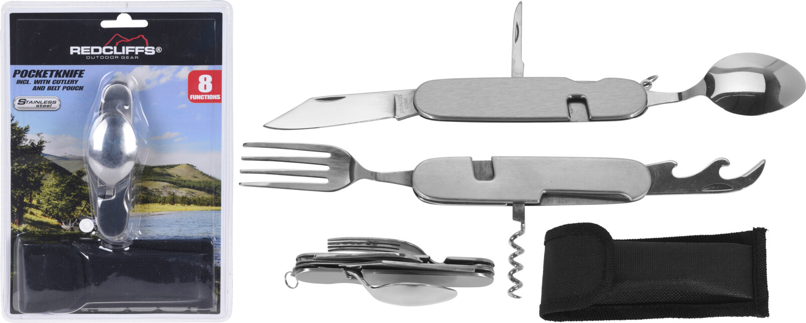 Monitoimityökalu, jossa lusikka, haarukka, veitsi, korkkiruuvi, pullonavaaja, tölkinavaaja ja naskali. Ruostumatonta terästä.