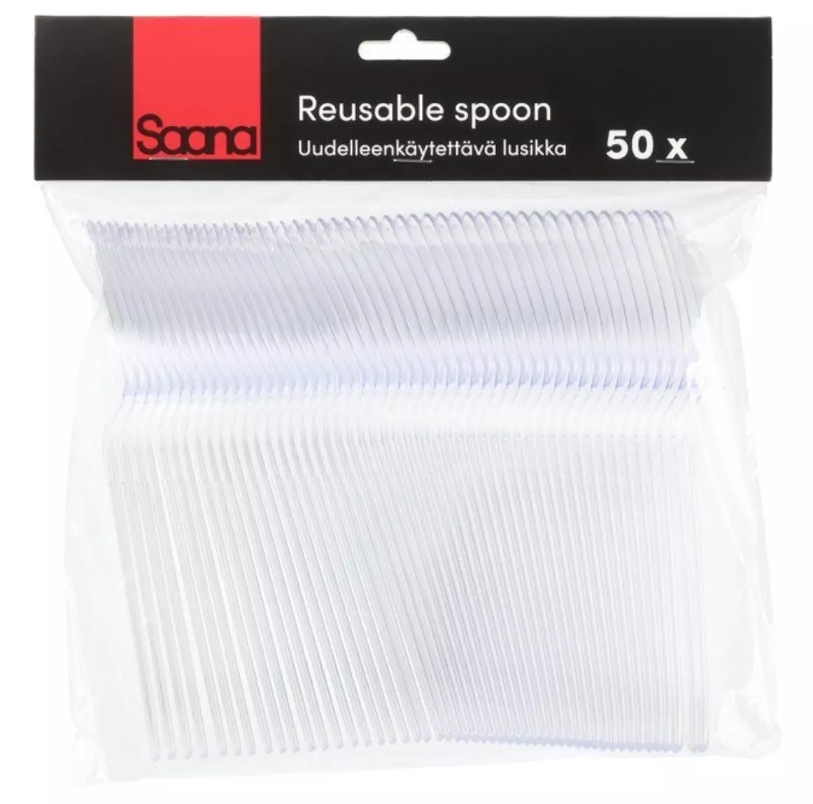 Saana ruokalusikka on kestävä ja uudelleenkäytettävä vaihtoehto arkeen ja juhlaan. Kirkas ulkoasu sopii monenlaisiin kattauksiin. Pituus 18 cm. Konepesun kestävä. Pakkaus sisältää 50 kappaletta.