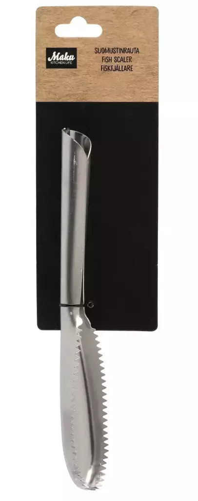 Sahalaitaisella suomustinraudalla poistat helposti ja tasaisesti kalojen suomut, jopa hankalammiltakin alueilta, kuten evien ja vatsan läheisyydestä. Konepesun kestävä.