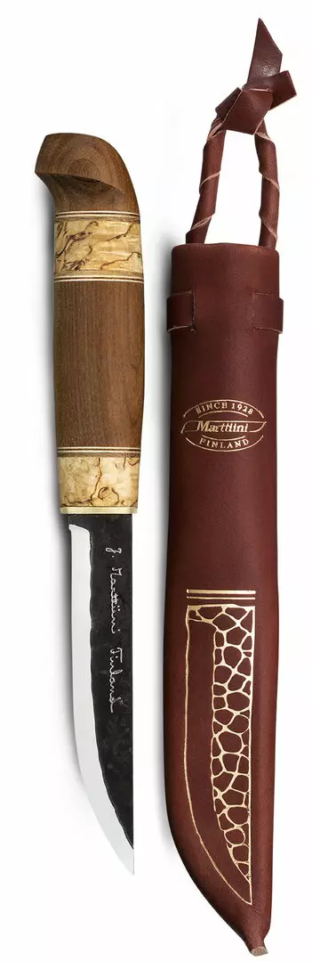 Kierinki on taitavan puuseppämme suunnittelema puukko, joka ilmentää käsityön kauneutta. Sen kahvassa yhdistyvät lämpökäsitelty koivu ja visakoivu sulavasti toisiaan täydentäen. Terä on kumpuilevaa hiiliterästä, joka jäljittelee käsitaonnan ainutlaatuisia jälkiä. Aito ruskea tuppi on koristeltu kauniilla kultafolioinnilla, joka kuvaa hiiliteräksen yksityiskohtia.