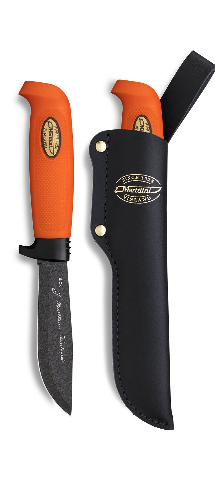 Skinner Martef -puukko on sarjan myydyin tuote. Terä on valmistettu ruostumattomasta teräksestä ja malliltaan se sopii erinomaisesti niin saaliin nylkemiseen kuin vuolemiseenkin. Karhennettu oranssi kumikahva ja sormisuojahela takaavat pitävän otteen vaativissakin eräolosuhteissa. Musta nahkatuppi.