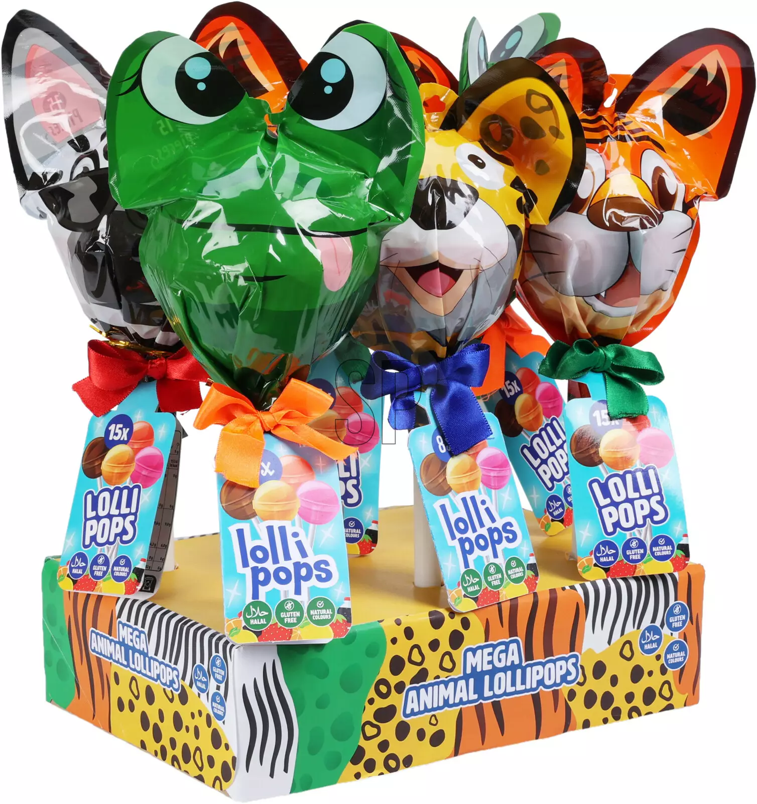 Eläinaiheinen jättitikkari, jonka sisällä 15 tikkaria. Tikkareita on erilaisia, makuina cola, sitruuna, appelsiini ja mansikka. "Eläimen kaulan" somisteena on silkkinauha.