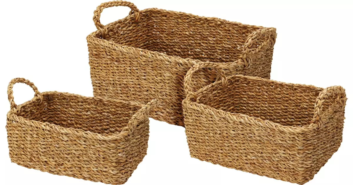 Sangallinen suorakaiteen muotoinen meriheinästä valmistettu kori. Saatavilla kolme kokoa.