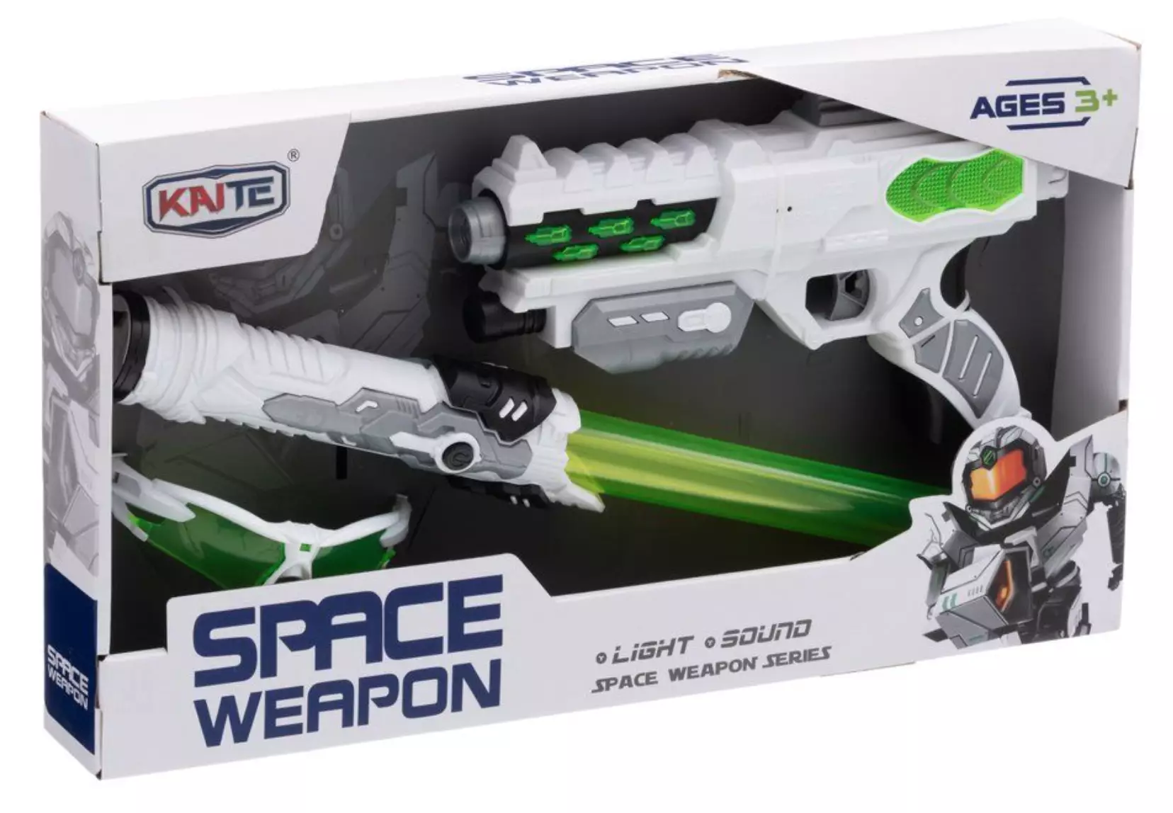 Leikkisetissä on paristokäyttöiset miekka ja avaruusase, joissa on sekä ääni- että valotoiminnot. ja lasit avaruusleikkeihin. Paristot 3 x AA ja 3 x AAA (eivät sisälly pakkaukseen). Ikäsuositus 3+.