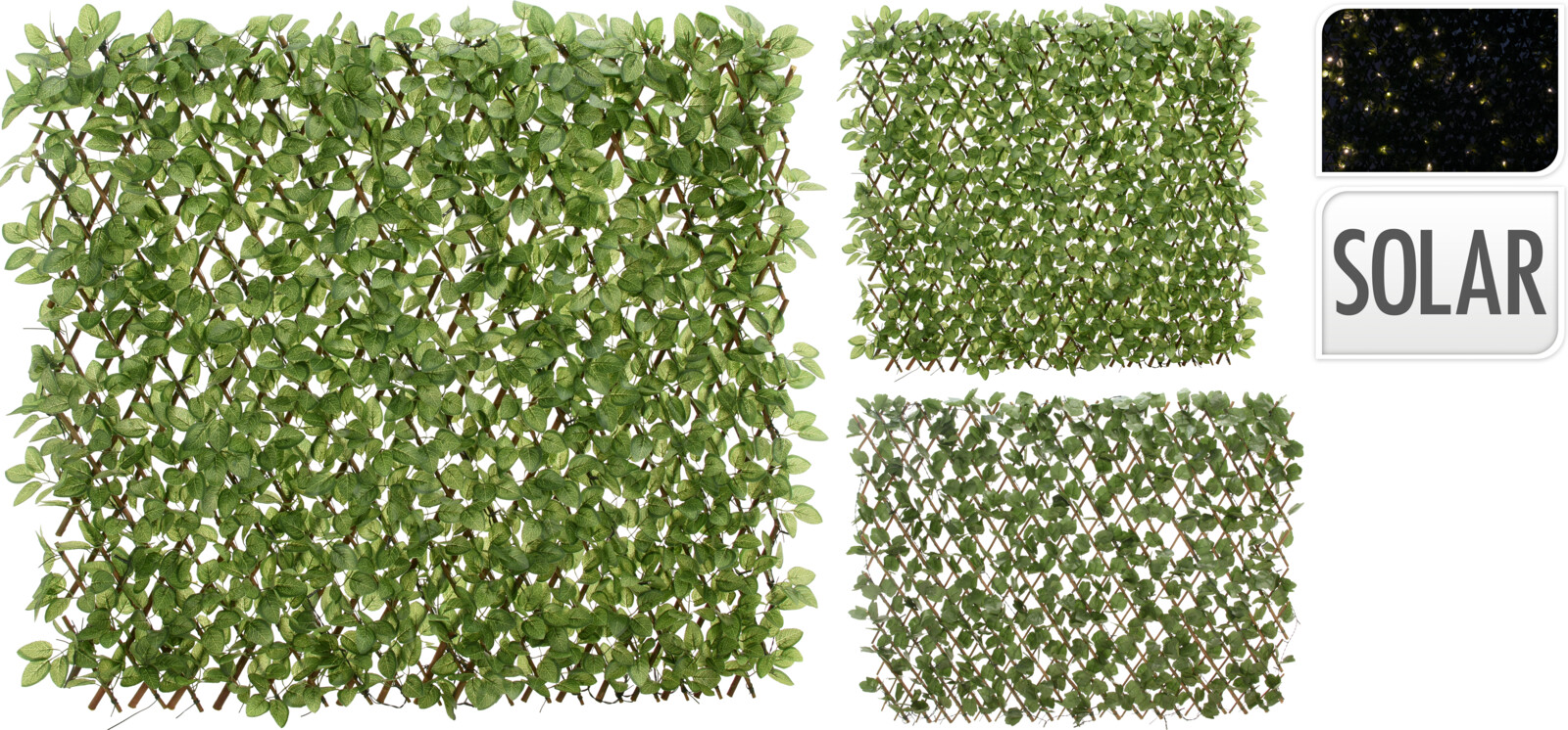 Puurakenteinen levitettävä säleikkö keinotekoisilla muratinlehdillä ja aurinkokennolla latautuvilla LED-valoilla. - 100 x LED - lämmin valkoinen valon sävy - täysin avatun säleikön koko 90 x... Lue lisää